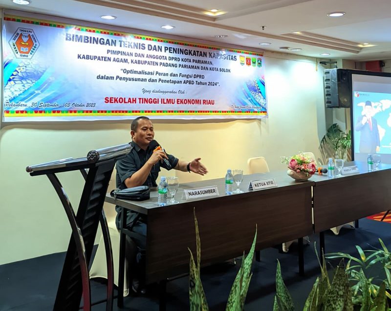 Bawaslu Riau, Pekanbaru – Anggota Bawaslu Provinsi Amiruddin Sijaya menjadi narasumber pada kegiatan Bimbingan Teknis dan Peningkatan Kapasitas Pimpinan dan Angggota DPRD Kota Pariaman, Kabupaten Agam, Kabupaten Padang Pariaman dan Kota Solok yang diselenggarakan oleh Sekolah Tinggi Ilmu Ekonomi Riau, Senin (02/10/2023) di Hotel Grand Elite Pekanbaru.