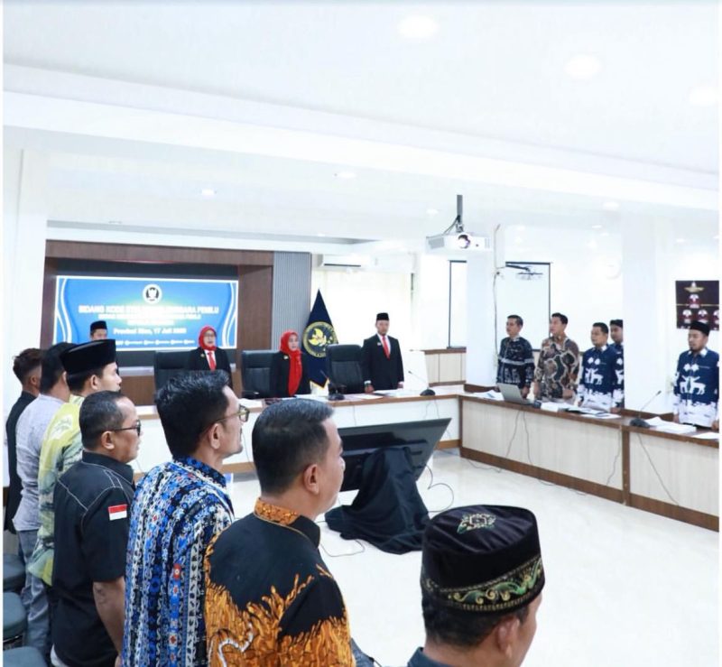 Pekanbaru, Bawaslu Riau – Ketua Bawaslu Kabupaten Pelalawan Andrizal beserta empat anggotanya, yaitu: Ari Nugroho Susanto, Bambang Sugi Hartono, Syakir Hamdani dan Rida Nur Kisawan jalani sidang pemeriksaan kasus dugaan pelanggaran Kode Etik Penyelenggara Pemilu, Kamis (17/07/2025).