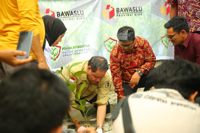 Usai menutup acara peningkatan kapasitas, Herwyn melanjutkan kegiatan dengan seluruh Bawaslu Kabupaten/Kota dan Panwascam se-Riau melaksanakan penanaman pohon integritas yang disimbolkan dengan pohon manggis.