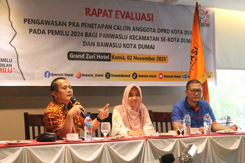 Bawaslu Riau, Dumai - Bawaslu Kota Dumai menyelenggarakan kegiatan Rapat Evaluasi Pengawasan Pra Penetapan Calon Anggota DPRD Kota Dumai pada Pemilu 2024 bagi Panwaslu Kecamatan se- Kota Dumai, Kamis (02/10/2023) di Grand Zuri Hotel Dumai.